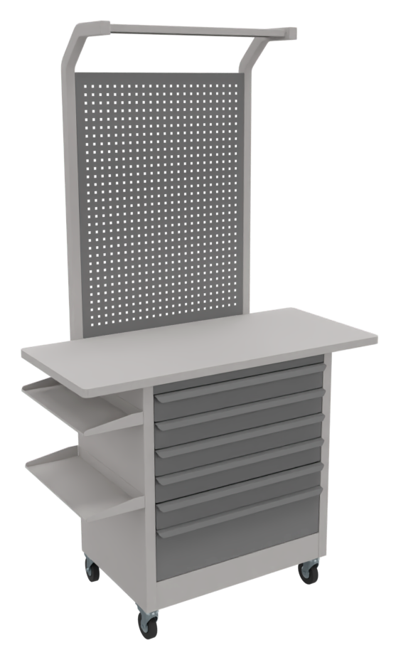 предназначено для удобного перемещения оборудования и комплектующих в пределах рабочей зоны. Оснащено колесной базой, два колеса из четырех со стопорным механизмом.