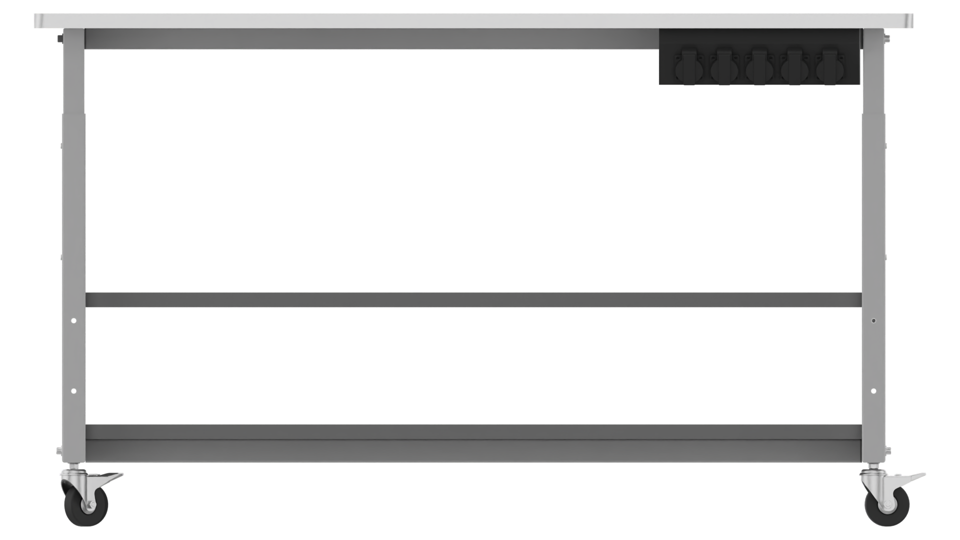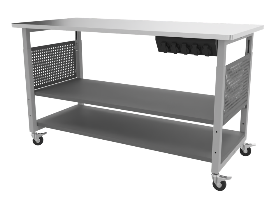 Стол изготовлен из металлического каркаса, покрытого эпокси-полиэфирной порошковой краской, столешницы и нижней полки. Возможно антистатическое и общепромышленное исполнение.